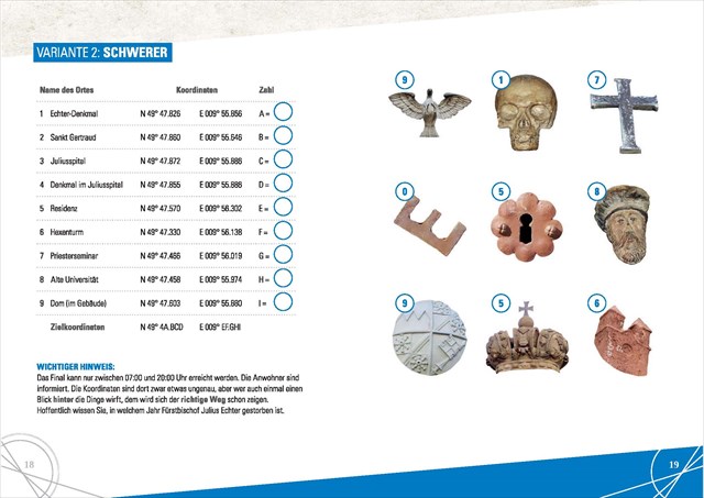 Dieser Multicache führt ca. 3 km durch die Würzburger Innenstadt an historische Orte, an denen das Leben und Wirken von Fürstbischof Julius Echter in den Blick genommen wird. Den verschiedenen Orten müssen Detailaufnahmen zugeordnet werden. Durch die richtige Zuordnung der Fotos ergeben sich die Koordinaten für das Final.