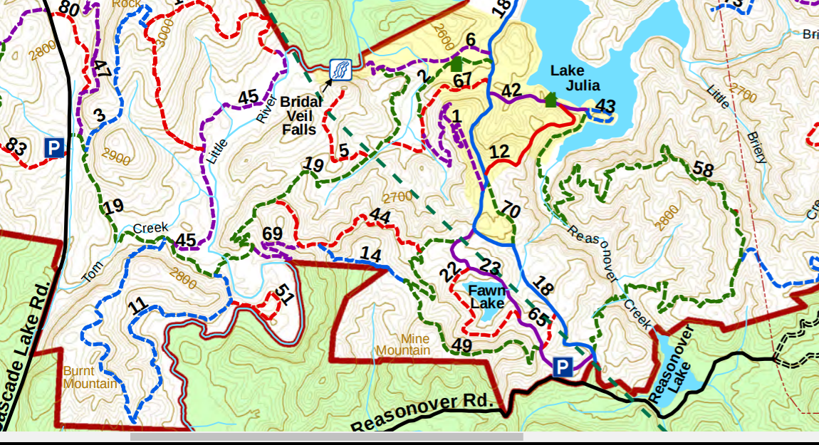 You don't *have* to start at the Corn Mill Shoals parking lot, but it will make for a smoother cache-to-cache routing. You may want to consider clicking the Related Web Page link above and printing out or loading to your phone the detailed trail map. Trails in order from the Corn Mill Shoals parking lot: cross the main road and get started on the Corn Mill Shoals Trail (#19) -- ford the Little River -- take a right onto Shoals Trail (#69) -- take a right/keep straight onto Laurel Ridge Trail (#44) -- not long after take a hard right onto Cart Trail (#14) -- right onto Mine Mountain Trail (#49) -- right onto Fawn Lake Road (#23) -- restroom facilities at Fawn Lake parking lot -- cross Conservation Road (#18) and go straight onto Reasonover Creek Trail (#58) -- after a couple of miles take a right onto the short Lake View Loop (#43) [Optional, but great lake views AND a non-series geocache] -- straight onto Lake Julia Road (#42) -- take a right onto Conservation Road (#18) -- not long after take a left onto Shelter Rock Trail (#67) -- take a left onto Corn Mill Shoals Trail (#19) -- ford the Little River again -- continue back to the parking lot.