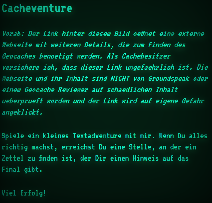 Am Finale wird eine Baumkletter-Ausrüstung benötigt, die Dose ist aber stammnah. Der Cache sollte ursprünglich "wget" heißen, musste aber etwas umgestaltet werden. Das Logbuch vor Ort trägt noch den alten Titel, also bitte nicht wundern.