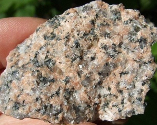 La composition minéralogique associe un plagioclase dominant, du quartz (plutôt translucide), du feldspath potassique (de couleur rose), de la hornblende verte et de la biotite (de couleur noire).