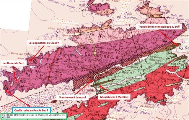 L'observation de la carte BRGM nous donne comme formation de la partie la plus septentrionale le leucogranite de Lokeltas.