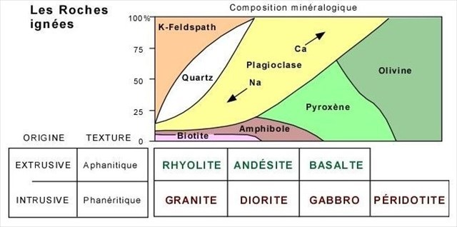 En effet, la différence entre basalte et gabbro, andésite et diorite, rhyolite et granite, ne se situe pas au niveau de la composition qui est la même pour chacune des paires, mais au niveau de la cristallinité, soit la taille des cristaux.