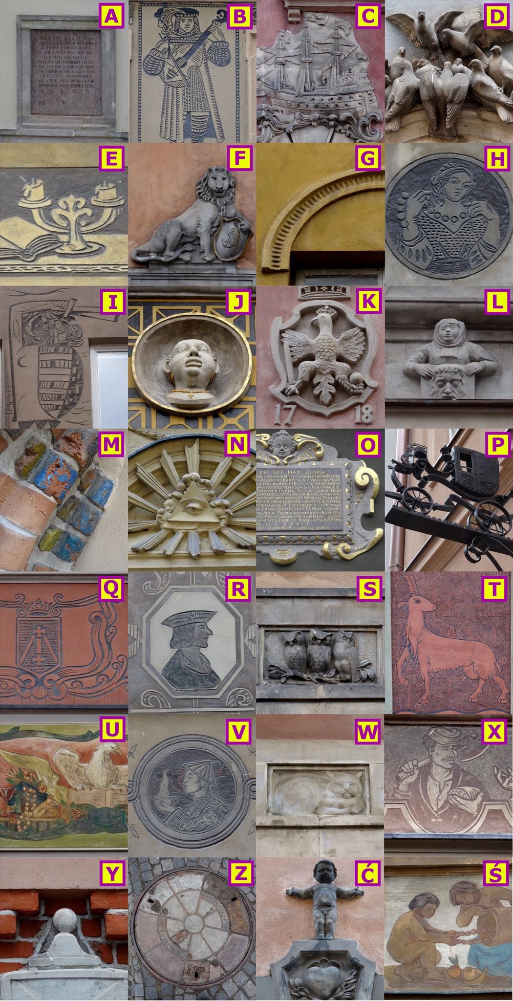 The task is simple – below you can see 28 photos of the details hidden at the Old Town houses and other objects, each of them is signed with a letter from A to Z.
