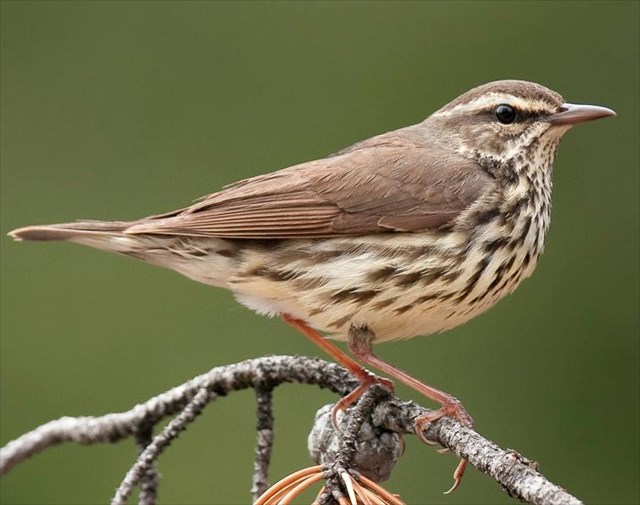 The Northern Waterthrush (Parkesia noveboracensis) sings its loud, ringing song from wooded swamps and bogs. It is a small songbird with a brown back, creamy or whitish underside with dark stripes, and a whiteish or yellowish eye stripe. They breed in thickets near slow-moving streams, ponds, swamps, and bogs like the one here. In migration and winter, they use a variety of wooded habitats, generally near water. They eat insects, arthropods, snails, and occasionally small fish, feeding mainly on the ground, and occasionally by wading in shallow water. The nest is an open cup of moss and leaves, lined with fine plant stems, rootlets, hair, and moss. May construct entranceway of whole dead leaves. Nest placed in small hollow or cavity under fallen log, or within roots of an upturned tree.