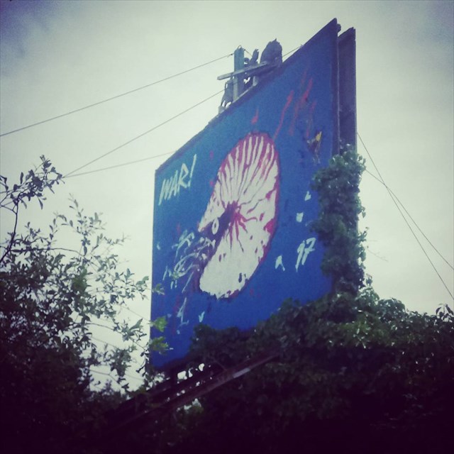 War! s'est approprié ce panneau depuis que je collectionne ses oeuvres, d'abord un visage crachant des couleurs, puis sa signature, ensuite l'adresse de son site web, sa dernnière repasse* fait apparaitre une nouvelle oeuvre que je vous laisse découvrir