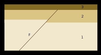 Dans l’exemple ci-dessous, la faille/filon F est postérieur aux strates 1 et 2, mais antérieure à la strate 3.