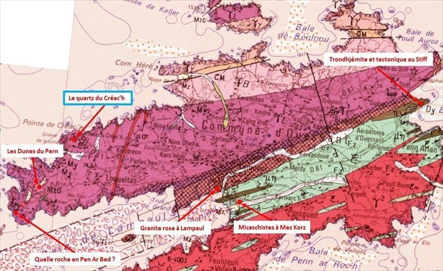 These powerful tectonic movements are at the origin of several faulty structures bringing into contact abnormal different types of rocks, mainly of granite nature (granite with two micas of Lokeltas, pink porphyroïde granite, ...), especially in the northern part, with A median depression excavated in metamorphic rocks (micaschistes ...), but also original intrusive formations such as trondhjemite or pegmatite.