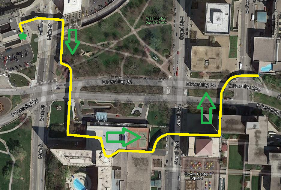 For over a hundred years this part of Kansas City has been a hub of commerce, community and culture. From the grandeur of Union Station to the elegance of Crown Center you can find entertainment, history and beauty at every turn. The Link is an elevated pedestrian walkway that zig zags Pershing Road connecting points of interest and offering views of some of the best spots in KC. Come and join me on this linear intercache that begins at the modern marvel that is Union Station and snakes its way East asking questions and teaching about the history of the area.