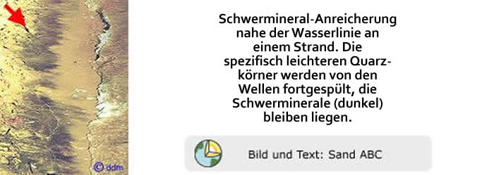 Magneteisenstein (wissenschaftlich auch Magnetit genannt) ist wie der gesamte Sand das Produkt der Verwitterung von Gestein. In unserem Fall waren es Gesteine aus dem Norden Skandinaviens, deren Sand durch die Gletscher in unsere Regionen transportiert worden ist. Die Gletscher und ihr Schmelzwasser haben das Gestein zu Sand (Magnetitsande) zerkleinert. Da Magnetit (d = 5,2 g/cm3) eine höhere Dichte als Quarzsand (d = 2,65 g/cm3) hat, sortieren ihn die Wellen heraus: Der leichte Quarzsand wird weggespült, der schwere Magnetitsand bleibt liegen und reichert sich in der Grenzzone der Brandung an. Solche Anreicherungen nennt man übrigens "Seifenlagerstätten". Du kennst vielleicht das "Seifengold". Die Hauptmenge des Magnetitsandes an diesem Strand stammt aus dem sagenhaften Eisenerzlager von Kiruna in Nordschweden. Der Erzkörper wurde im Präkambrium vor etwa 1.600 Mio. Jahren nach intensiven vulkanischen Aktivitäten gebildet. Aus eisenreichen Magmen präzipitierte das Eisen auf einem Syenitporphyr-Grundstock. Danach wurde das Erzbett durch weitere vulkanische Lagerstätten sowie Quarzporphyr und von Sedimenten bedeckt. Das Erz besteht aus einem hochreinen Magnetit-Apatit-Gemisch, wobei das schwarze Erz weniger Apatit als das graue Erz enthält.