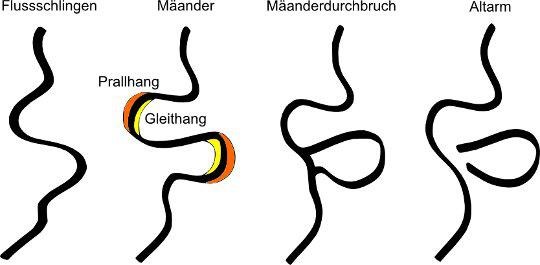 Ein natürlicher Fluss- oder Bachlauf ist also in ständiger Veränderung begriffen, die Mäander breiten sich immer weiter aus, wodurch die Gesamtlänge des Flusses oder Baches immer mehr zunimmt. Gleichzeitig kommen sich die einzelnen Mäanderschlingen während dieses Prozesses immer näher. Gelegentlich kommt es dann vor, dass die Strömung das an einer solchen Stelle nur noch schmale Ufer durchbricht und eine ganze Mäanderschleife damit abgekürzt wird. Aus der Schleife wird dann ein stehendes Gewässer, ein sogenannter Altarm oder Altwasser.