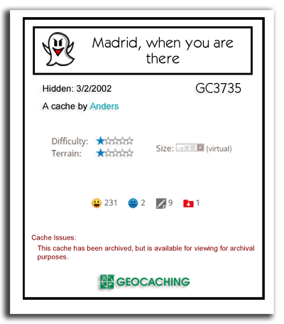 Recorriendo el tablero, contemplaréis algunos de los caches más recomendados de la comunidad, pero no se trata de puntos favoritos, ni mucho menos. Son tesoros que por uno u otro motivo son muy recomendables visitar. Por supuesto, esto es una opinión personal; si quisiéramos mostrar todos los caches que se lo merecen, esta serie no tendría fin, así que hemos tenido que hacer de tripas corazón. Valga este pequeño homenaje como reconocimiento al gran esfuerzo que hacen todos los geocachers.