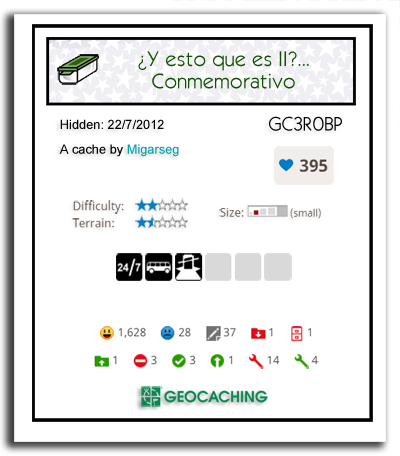 Entre tantos caches buenos que tenemos en la comunidad (y los hay increibles), hay una serie en particular que tiene un nivel tremendo y es que el propietario, Migarseg, tiene una imaginación prodigiosa, unida a una capacidad de llevar sus ideas a la práctica genial. Este en concreto, el II es un conmemorativo que viene a ser el cache que más puntos favoritos tiene en la comunidad: casi 400.