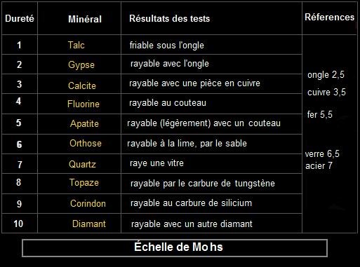 Mohs scale or scale of mineral hardness . The principle of using the Mohs scale is very convenient : a mineral is harder said than another, if the latter lines . The hardnesses are classified with respect to those of mineral - 10 test :