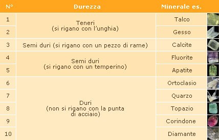 Scala Mohs o scala di durezza minerale. Il principio dell'utilizzo della scala Mohs è molto conveniente: un minerale è più difficile di altri, se le ultime righe. Le durezze sono classificate rispetto a quelle del test minerale - 10: