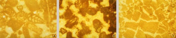 Medium-Veined (Venato Medio) Marble is made up of bioclastic granules, foraminifers (fragments of fossils and algae, and interclasts of microcrystalline calcite in a mosaic of partially recrystallized calcitic micrites (fig. C).