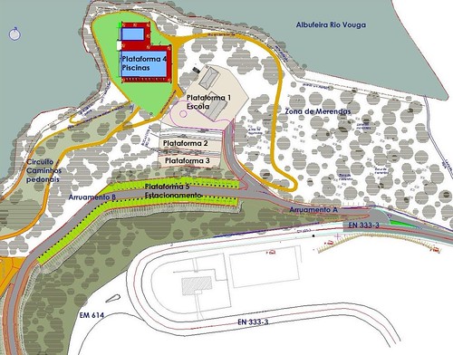 Nesse sentido, o objetivo do Parque de Fruição é o de proporcionar aos utentes bons momentos de fruição da natureza, num ambiente fluvial tranquilo, saudável e funcional. Conseguir este propósito numa encosta de declives acentuados só é possível estabelecendo várias plataformas. Assim, e com base na cota 124m da plataforma existente da Cantina da Escola, onde serão instalados os balneários de apoio às piscinas, são fixadas mais 3 plataformas de referência: a das piscinas, à cota de 118m, e as duas plataformas para a realização de eventos, às cotas de 128 e 130m, confinantes a sul com a plataforma da Escola.