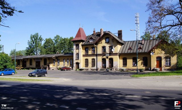 Dworzec zbudowany po 1892 r. (według wykonanego w tym roku projektu; podpis autora projektu nieczytelny, projekt zatwierdzony do realizacji w 1892 r.). Mur., tynk., składający się z dwukondygnacyjnego korpusu głównego (biura) dwiema jednokondygnacyjnymi przybudówkami (magazyn z rampą bagażową oraz poczekalnia z kasami); nakryty wielopołaciowym dachem ceramicznym. Bryła przestrzennie rozczłonkowana z narożnym, wieżowym ryzalitem."