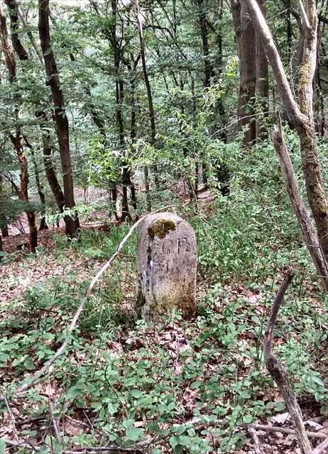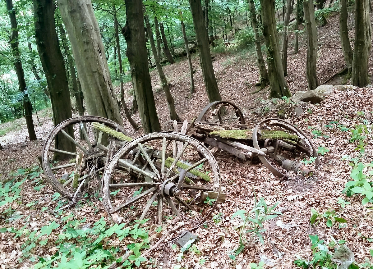 Hier - jetzt mitten im Wald! - muss einmal eine Straße (?) - ein Weg (?) - ein Fuhrweg (?) gewesen sein, wie auch ein Meilenstein (Kilometerstein?) zwischen den Bäumen beweist. An dieser Straße ist vorzeiten ein Pferdefuhrwerk gestrandet, dessen Reste an einsamer Stelle im Wald langsam vor sich hin modern - umgeben von aufgegebenen Weinterassen. In diesem Tal wurde bis Anfang des 19. Jahrhunderts Alaun abgebaut.