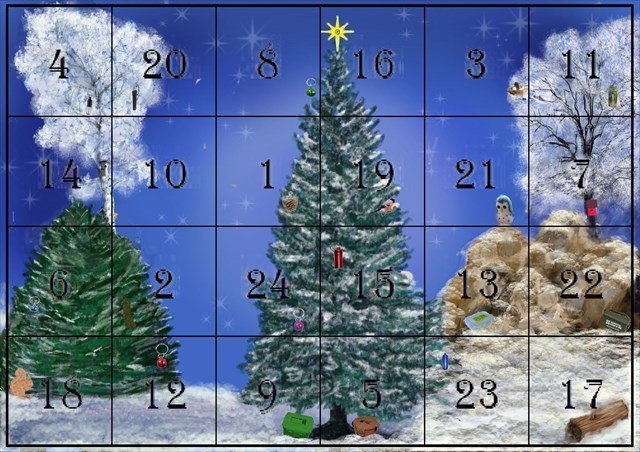 Jokaiseen kuvaan on piilotettu kirjain (11 kpl) tai numero (13 kpl). Etsi ensin kirjaimet ABCDEFGHIJ ja sen jälkeen niitä vastaavat numerot kalenterin kuvista. Kätkö löytyy koordinaateista N60 AB.CDE, E27 FG.HIJ