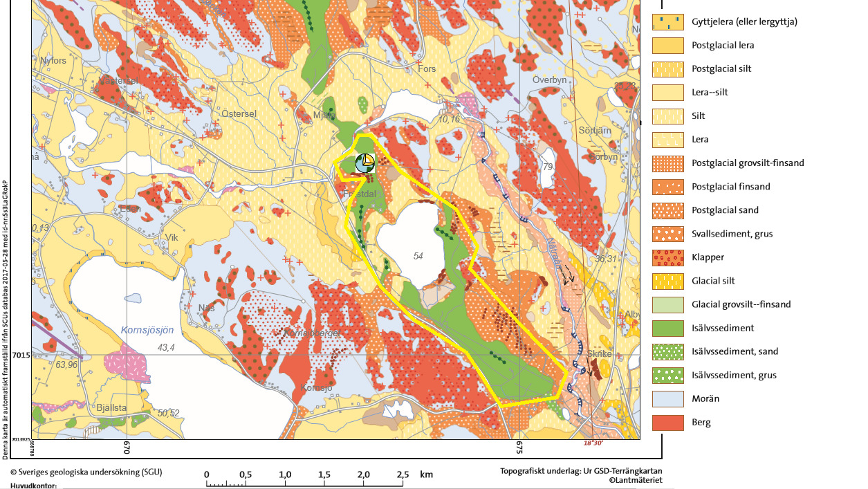 Bjästamon is an impressive glacial sediment from a glacial straem that ran here about 10,000 years ago. The ice sheet over this part of Sweden was very thick, about 3 km, and the melting went fast. The result was, of course, huge amounts of melt water, and thus very large accumulations of glacial sediment. Nevertheless, it is easy to overlook the mountains of glacial sediment, as the landscape is so hilly. But the surrounding mountains are part of the bedrock, unlike Bjästamon. On map from SGU you can see how Bjästamon differs in its structure compared to the surrounding mountains. The approximate extent of Bjästamon is marked with yellow, and the Earthcache is marked with a symbol.