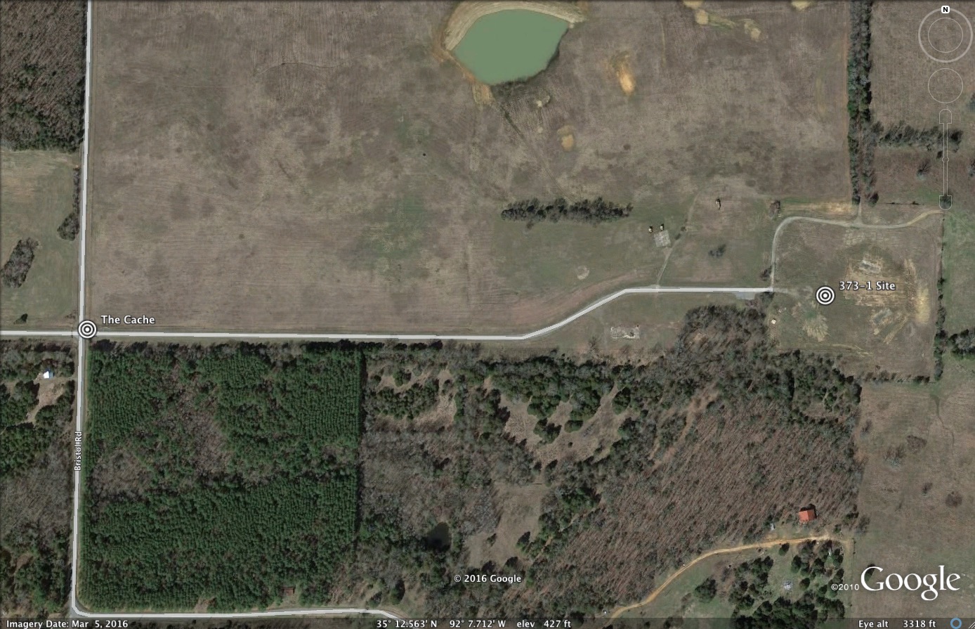 When you arrive at the posted coordinates, you will be standing on the old roadway to the abandoned missile site. The actual site is located on private land approximately 0.5 mile east of the cache location. (See photo below.) The road beyond the cache location passes through a locked gate, so please respect that and do not trespass if you are curious and want a closer look.