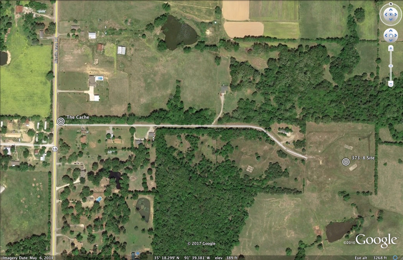 When you arrive at the posted coordinates, you will be standing near the old roadway to the abandoned missile site. The actual site is located on private land approximately 0.45 mile east of the cache location. (See photo below.)