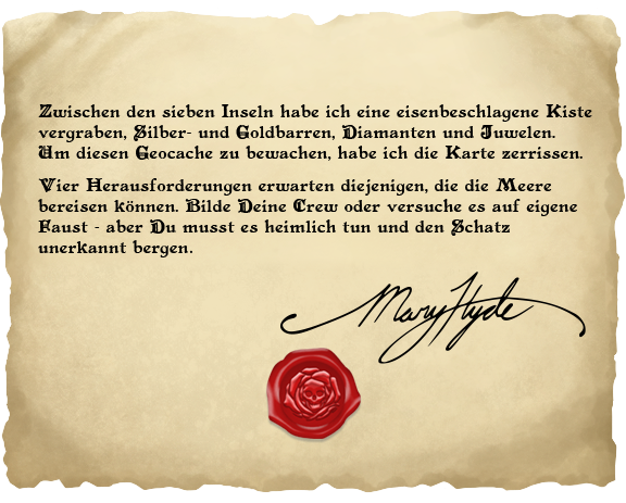 Wir haben einen stark beschädigten Brief erhalten, welcher in einer Flasche an der Küste nahe des Geocaching Hauptquartiers gefunden wurde. Am Ende des Briefs befindet sich ein Stempel der berüchtigten Krone von Kapitän Mary Hyde. Es scheint, dass es noch einen letzten Schatz zu finden gilt.