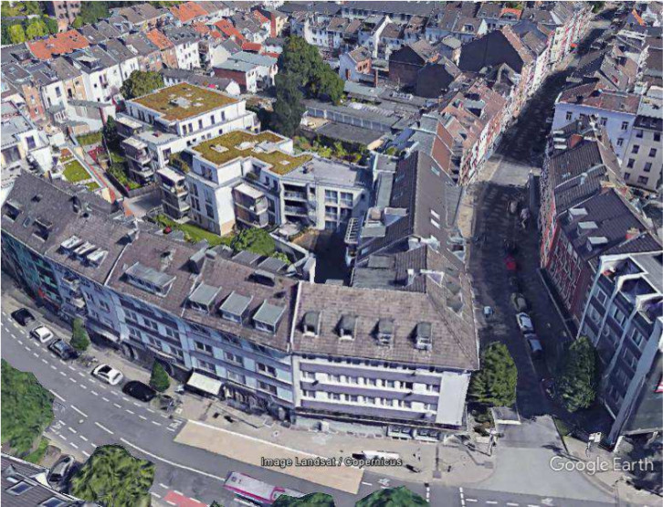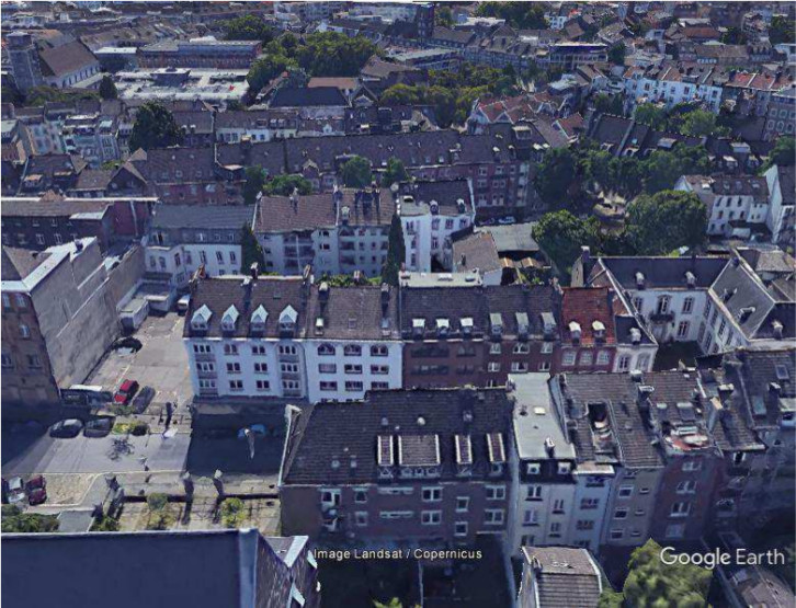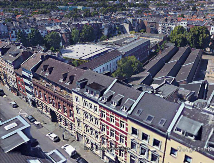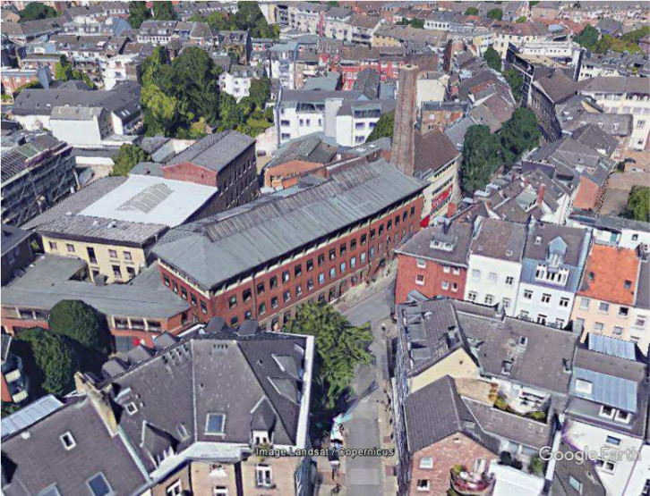 Die meisten der in diesem Rätsel behandelten Fabrikanlagen gehen auf eine der vielen Mühlen an den Aachener Bachläufen zurück. Bei der hiesigen Tuchfabrik war es die als Kupfermühle 1517 erstmals erwähnte ‘Weiße Mühle’. Die Fabrik stellte 1992 ihren Betrieb ein und wurde mittlerweile abgerissen. Am linken Bildrand ist ein älteres Gebäude mit einer hohen Brandwand zur Nachbarbebauung stehen geblieben.