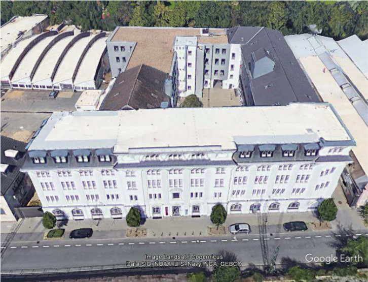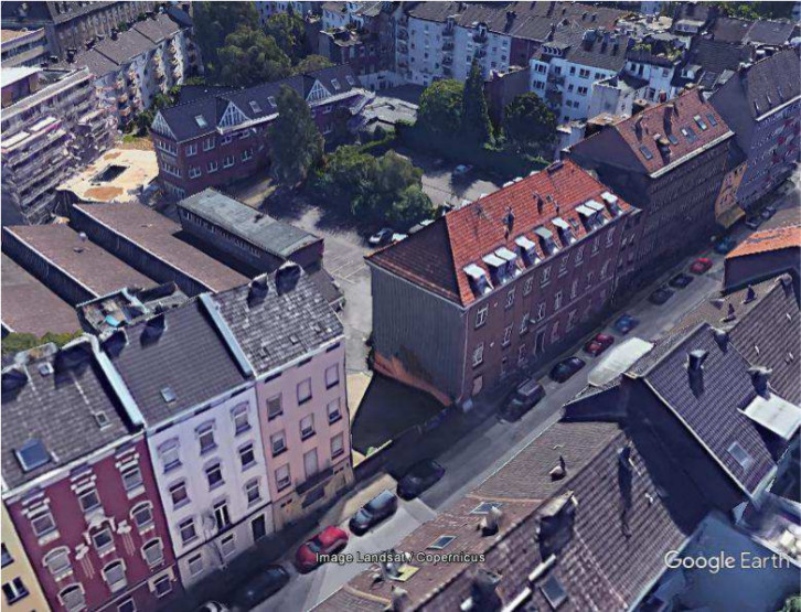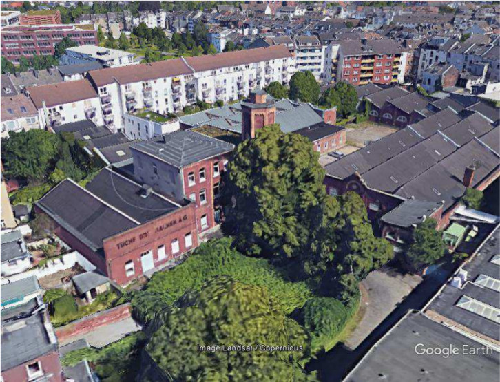 Auf dem obigen Bild ist das jüngste der in diesem Rätsel vorgestellten Fabrikgebäude zu sehen. Es wurde 1952 auf dem Grundstück einer zwischen 1825 und 1830 hier angesiedelten Tuchfabrik errichtet, die schon 1860 auf das Gelände eines heutigen Krankenhauses expandierte. Neben dem Schornstein ist auch die im Hof erhaltene sogenannte Blauerei älteren Datums. Vor der Südfassade des Gebäudes steht ein kleiner, weisser Transporter.