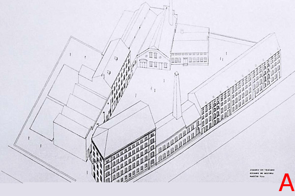 Dieses Objekt war 1963 eine von fünf übrig gebliebenen Nadelfabriken in Aachen. Die seinerzeit hier ansässige Firma hat ihren mit der Nadelproduktion verbundenen Namen bis heute behalten, widmet sich jedoch mittlerweile auf einem Grundstück nebenan anderen Geschäftsfeldern. Der graue Gebäudeflügel auf der rechten Seite hat im Innenhof zwei Reihen rot und gelb angelegter Fensteröffnungen.