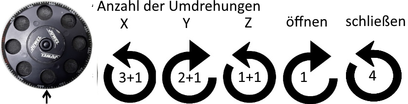 Nachdem die Zahlen (X,Y,Z) wie beschrieben eingestellt wurden, die Wählscheibe langsam rechts bis zum Anschlag drehen und die Tür öffnen.