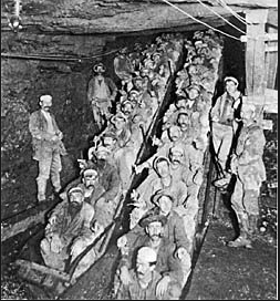 Miners preparing to descend into the nearby abyss.