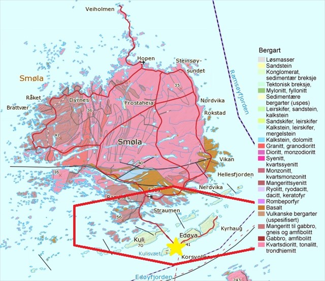 Konglomerat lagene vi har her ute på Edøya er av sandstein og leirstein. Konglomerat beltet sprer seg over et stort område her ute som en kan sees på øyene og i områdene: Blåsværet, Hoøya, Arnøya, Kuli, Havreøyan, Kyrhaug, Lauvøya, og Glassøya.