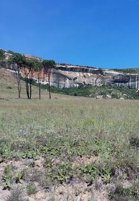At GZ, the veld gently slopes upwards towards the cliffs. On the left side the beginning of a few very interesting rock “arch shapes” are visible behind the trees.