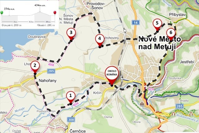 Z doporučených parkovišť se vydejte po cyklotrase č. 4034 směr Černčice. Na křižovatce cyklotras u mlýna v Černčicích odbočte vpravo na cyklotrasu č. 4059 směr Nahořany a Lhota u Nahořan. Ve Lhotě odbočte opět vpravo na cyklotrasu č. 4058 do Šonova. Zde pozor, opusťte cyklotrasu a vydejte se doprava směrem na Vrchoviny či Nové Město nad Metují. Za cedulí Šonov v levotočivé zatáčce, ještě před mostkem, odbočte vpravo na zprvu zpevněnou, poté již polní cestu, která vás po chvíli dovede na asfaltku do blízkosti letiště. Zde pak pokračujte vlevo do Vrchovin, opatrně překonejte hlavní cestu z Nového Města nad Metují do Náchoda a stoupejte na Přibyslav, což je nejvýše položený bod trasy. Odtud se pak příjemně svezete za doprovodu žluté turistické značky do Nového Města, u sokolovny se napojíte na cyklotrasu č. 4034 a celý okruh se tím uzavře. Jako bonus si cestou na start můžete zajet pro finálku, od které je, jak jinak, krásný pohled na náš komín.