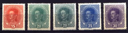 Obrázek: Karla I. Habsburského, stejně jako jiné státníky, lze nalézt i na poštovních známkách, zde série známek Rakousko-Uherska z roku 1917 podle návrhu A.Cossmanna, katalogové číslo Mi 221 – 224. Tytéž známky, ale s přetiskem "Pošta Československá 1919", se používaly i několik měsíců po vzniku samostatného Československa.