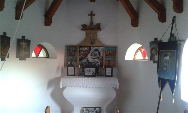 Obrázek: Pohled do interiéru kapličky skrze nevelké okénko ve dveřích.
