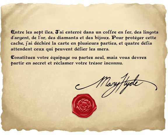 Nous avons découvert une lettre abîmée, trouvée dans une bouteille VERTe sur une plage près de l'étang de Pisse Vache à Bournazel. Avec la crête infâme du capitaine Mary Hyde estampillée au fond, il semblerait qu’il y ait encore un dernier trésor à découvrir.