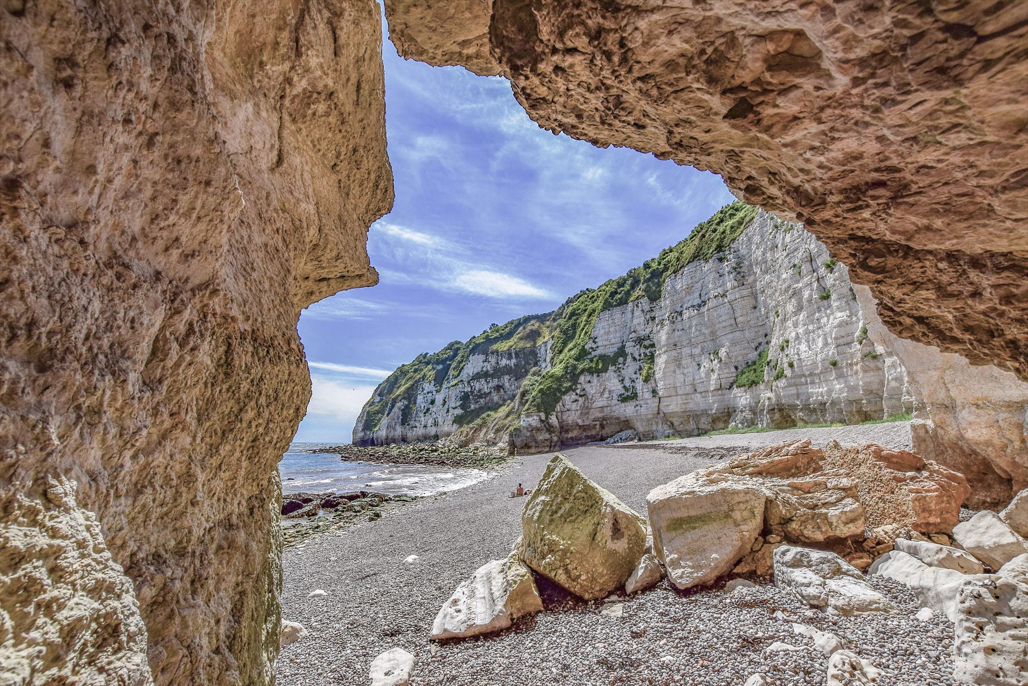 Areas on a stretch of coast that have small cracks and joints on them are particularly susceptible to attack from waves. This can be because of hydraulic action, where air becomes trapped in joints on a cliff and weakens the rock as the air is compressed. It could also be due to abrasion (the grinding down of rock by fragments of rock and sand), or solution (acids dissolving softer rocks like chalk, as can be found here). The area below the crack or joint will be undercut and a small cave will form. If the cave forms on a headland, then on the opposite side of the headland, a second cave can also begin to develop simultaneously. The water erodes the caves through the processes described above, and as the two caves are eroded and cut into the headland, they will eventually meet. The resulting landform is then referred to as an arch.