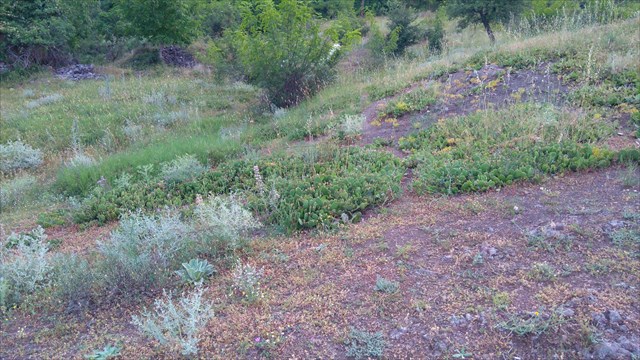 If you wish to visit this place, you need to exit the highway E75 and enter the city Demir Kapija. Proceed on the main road through the city and cross the Vardar River on a narrow bridge. Continue on this road about 4.2 km. The road is macadam, a little bit dusty, but okay for any car (you don’t need jeep). At the waypoint R1 you need to turn right, i.e. south, and continue on asphalt road about 2.5 km. The road ends near a small village church of St. Nicola. You can enter in the church yard and have a look. The cacti grow on the slopes west of the church, very near.