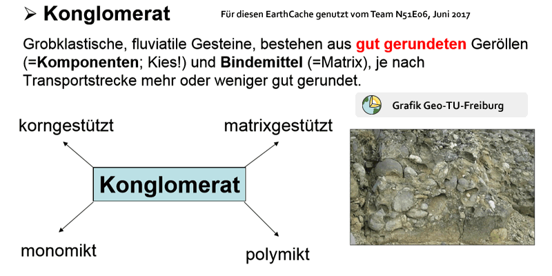 beschäftigen wir uns aus der Gruppe der Sedimentgesteine mit dem Konglomeraten, einem Gestein, welches aus mindestens 50 % gerundeten Komponenten (Kies oder Geröll) besteht und durch eine feinkörnige Matrix fest umflossen eingebettet verkittet ist. Der Name Konglomerat wurde in Anlehnung an das Aussehen des Gesteins gewählt. Conglomerare ist lateinischen Ursprungs und wird mit zusammenrollen oder zusammenballen übersetzt. Charakteristisch für Konglomerate sind kantengerundete, grobe Kiese und Schotter, welche sowohl im marinen als auch Süßwasserbereich entstanden sein können. Das Gefüge von Konglomerat ist nicht korngrößensortiert. Die gerundeten, psephitischen Kiese und Schotter sind in einer feinkörnigen Gesteinsmatrix eingebettet, deren Bestandteile kantig oder gerundet sein können. Die Lagerung der Psephite in Konglomeraten variiert zwischen dicht nebeneinander gepackt (Orthokonglomerate) und locker, mit Abstand zum nächsten Kies miteinander verbunden (Parakonglomerate). Gelegentlich sind runde Hohlräume möglich. Die Dichte von Konglomeraten beträgt 2,3 bis 2,6 g/cm3 und richtet sich nach der Zusammensetzung des Gesteins. Für unseren EarthCache hier nehmen wir einen Mittelwert von imaginär 2,4 g/cm3 und damit beschäftigen wir uns auch in einer der nachfolgenden Fragen. Konglomerate werden entweder durch Flüsse hoher Transportleistung abgelagert oder sie bilden sich an Erosionsküsten.