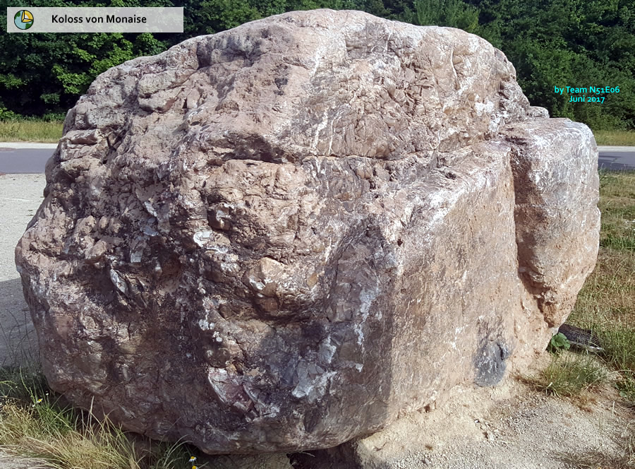 Der Koloss, den ihr hier seht, ist ein Konglomerat, der bei Baggerarbeiten während der Herstellung neuer naheliegender Wasserflächen gefunden und wegen seines enormen Gewichtes nicht weiter abtransportiert wurde. Er blieb gleich an Ort und Stelle in seiner jetzigen Position und kann nun im neuen Schutzgebiet Monaise von jedermann und von allen Seiten frei zugänglich besichtigt werden. Es ist keiner der sog. Findlinge, die überall und in Massen am Wegesrand liegen, sondern schon eine Besonderheit, die durchaus einen interessanten geologischen Wert darstellt.