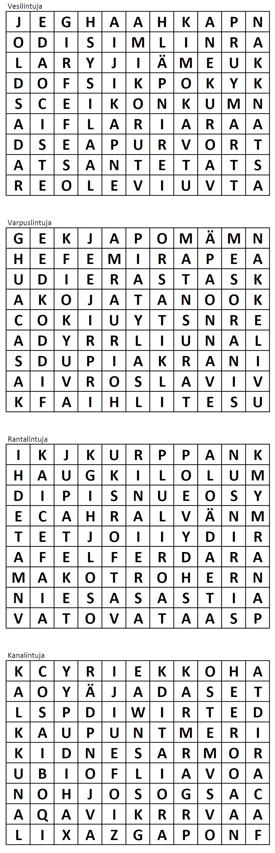 A: Kahden vesilinnun nimessä kaikki kirjaimet ovat eri kirjaimia. Monta kirjainta niistä pidemmässä nimessä on ?