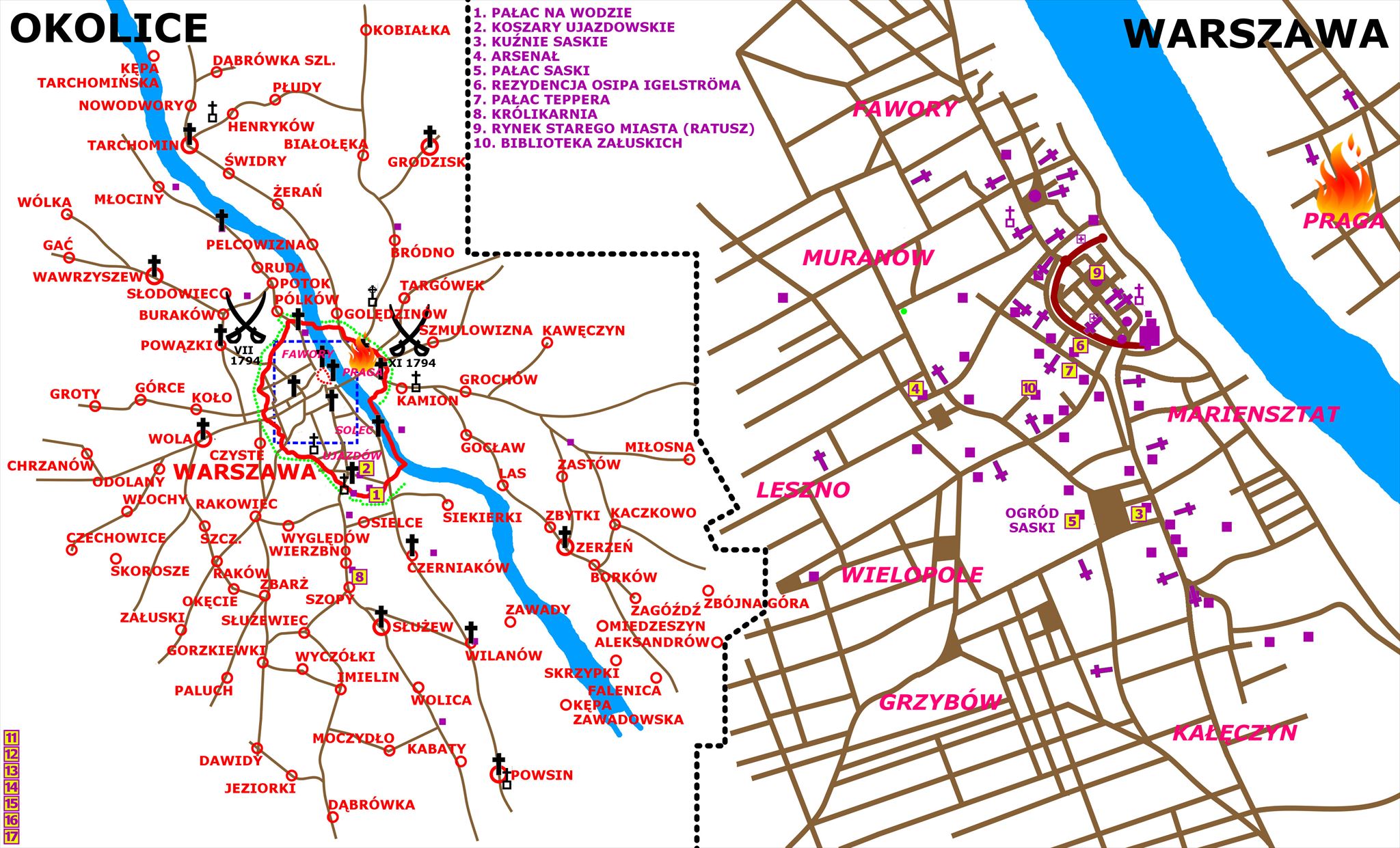 Prussia and Russia took advantage of the capitulation of Stanisław August Poniatowski and on 23 January 1793 agreed on the Second Partition of Poland, and the assigment of the territory was approved in Grodno on 22 July toward Russia and on 25 September toward Prussia. Humiliated Commonwealth became dependent on Russia and experienced the economic and financiasl collapse initiated by the bankruptcy of the Piotr Tepper's bank. Works on the construction of the Palace on the Water were completed. Nevertheless, Tadeusz Kościuszko, honored in the battle, developed the idea of a liberation uprising, but the Russian ambassador Iosif Igelström detected the conspiracy in January 1794 and ordered a reduction of the Polish army. The signal to the uprising was given by Gen. Antoni Madaliński, who marched out of Ostrołęka, and on 24 March Tadeusz Kościuszko announced the outbreak on the market square in Kraków. After the victorious battle at Racławice, the people of Warsaw joined the fight on 17 April – it was leaded by the shoemaker Jan Kiliński and the butcher Józef Sierakowski, the fight joined also the soldiers called "działyńczycy" leaded by the Col. Filip Hauman from the Ujazdowski Barracks. His march was stopped at the Saxon Forges by Col. Fiodor Gagarin, but he was killed after the fight lasting around 90 minutes. Insurgents took control over the key objects like the Arsenal or the Saxon Palace, they forced the ambassador Iosif Igelström to leave his residence at the Miodowa St. and robbed the neighboring residence of Piotr Tepper, who was seriously injured and died few days after. The power was taken by the Temporary Council, and the headquarters of Tadeusz Kościuszko was located in Królikarnia. On 9 May in the Old Town Market Sqaure the gallows were set up, in the City Hall the traitors and participants of the Targowica Confederation were judged and then hanged. Petrified Primate Michał Poniatowski committed suicide, and the King Stanisław August Poniatowski was under house arrest. On 13 July the Prussian army started the siege of Warsaw, the defence leaned on the modernised Lubomirskiego Trenches and was commanded by Gen. Józef Poniatowski and Gen. Jan Henryk Dąbrowski, but on the news of the outbreak of the insurrection in Greater Poland the Prussians abandoned the siege. After the defeat of Jakub Jasiński in Vilnius and Tadeusz Kościuszko at Maciejowice the Russian and Prussian armies came back to Warsaw and on 4 November they broke the defense lines and took over Praga, where the soldiers of Gen, Alexander Suvorov slaughtered around 20 000 of inhabitants, including Gen. Jakub Jasiński. The next day Warsaw surrendered, and the last insurgents finished their battles on 16 November at Radoszyce. The King left Warsaw on 9 January 1795 and went into exile to Grodno, where he abdicated. The collections of the Załuskich Library were transported to Petersburg. On 24 October Austria, Prussia and Russia signed the act of the Third Partition of Poland, and the Commonwealth of the Both Nations was liquidated. Warsaw was now in Prussia.