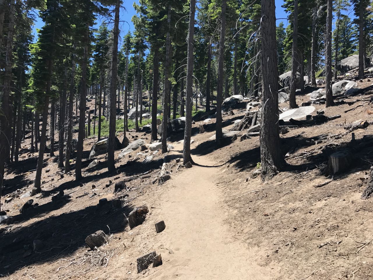 NOTE: As of 8 May 2024, the main entrance to DL Bliss State Park is closed, and so one cannot hike to this cache from DL Bliss. However, if one parks 350 meters (380 yards) to the south of the main entrance, one can hike down to the main Rubicon Trail, and from there northward to this cache, or southward to Emerald Bay and Vikingsholm. In particular: Park on Hwy 89 at N 38°58.5301' W 120°06.0146', then hike east heading to the "Rubicon trail: View platform" cache (GC783VW), or, more accurately, to: N 38°58.722' W 120°05.736'. There is a trail, but it is quite steep near the end.
