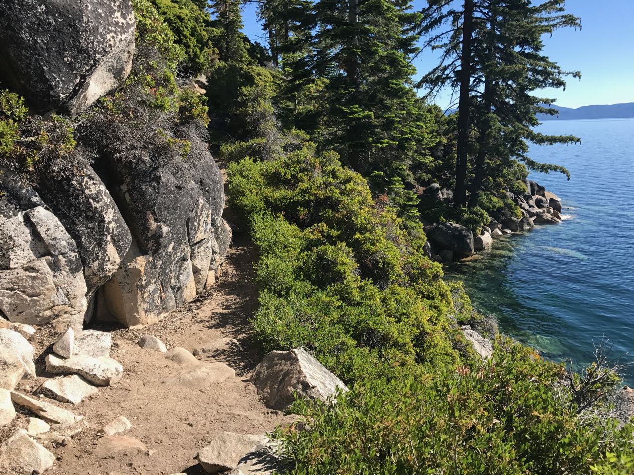 This is one of several geocaches along the Rubicon Trail, from the trailhead in D.L. Bliss State Park to the Vikingsholm house in Emerald Bay. It passes some lovely forest area and offers gorgeous views of Lake Tahoe and Emerald Bay. The trail is 3.5 miles long. Today the hike (in the uphill direction) took me 1 hour 15 minutes, without trying too hard.