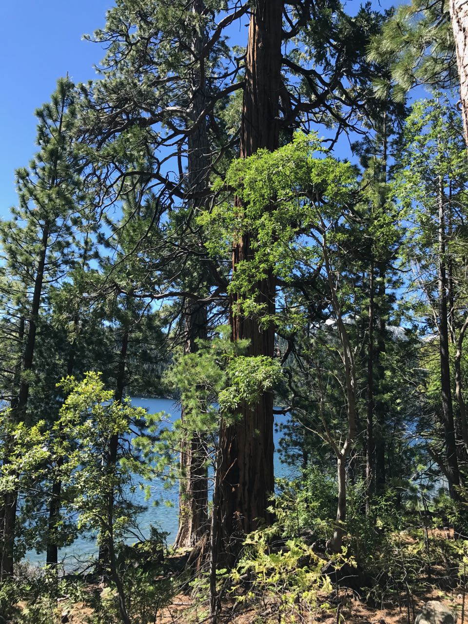 This geocache is near a majestic but gnarly incense cedar tree, near the Boat Camp on Emerald Bay.