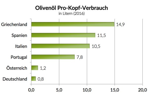 Jede Griechin und jeder Grieche verbraucht pro Jahr etwa 15 Liter Olivenöl. Damit sind die Griechen mit Abstand führend was den Pro-Kopf-Verbrauch des flüssigen Goldes angeht. Dahinter liegen die Spanier mit 11,5 gefolgt von den Italienern mit zehneinhalb Litern. Auch in Portugal wird viel mit Olivenöl gekocht. In Deutschland verbraucht der Durchschnittsbürger etwa einen Liter Olivenöl pro Jahr.