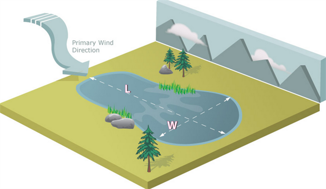 Due to winds picking up speed over open water the primary wind direction of the area can determined due to the shape of the lake. Wind moves water, sediment, and debris from one end of the lake to the other. The smaller end of the lake often times is where the wind starts and the larger end is where the wind carries.