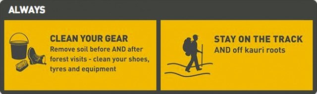 • Make sure shoes, tyres and equipment are cleaned to remove all visible soil and plant material before AND after visiting kauri forest.
